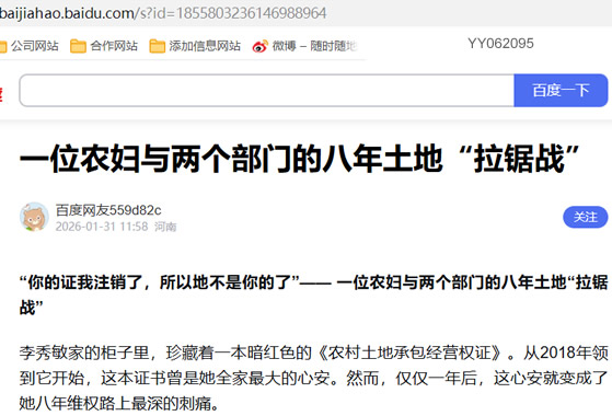 一本权证,对抗两枚公章。一个农妇,周旋于两套说辞之间。从2019年到2026年,她的土地在文件上“被消失”,她的诉求在程序里“被循环”。当守护权利的凭证本身成为被随意涂改和注销的对象,农民手中的“红本本”,究竟还能不能代表脚下那块坚实的土地?